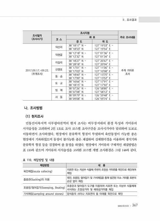 Ⅱ. 조사결과 www.nie.re.kr ? 367 조사일자 조사시기 조사지점 주요 조사내용 코 스 좌 표 경 도 위 도 2017.09.17.09.22. 추계조사 덕산리 38?1817N 38?1853N 127?1933E 127?1954E 추계 거미류 조사 덕현골 38?1218N 38?1232N 127?0136E 127?0134E 이길리 38?1827N 38?2818N 127?2047E 127?2094E 산명호 38?1701N 38?1703N 127?1106E 127?1098E 동 송 38?1840N 38?1799N 127?1370E 127?1352E 토 교 38?1666N 38?1815N 127?1791E 127?1792E 빙 애 38?0726N 38?0708N 126?5880E 127?5812E 사 동 38...