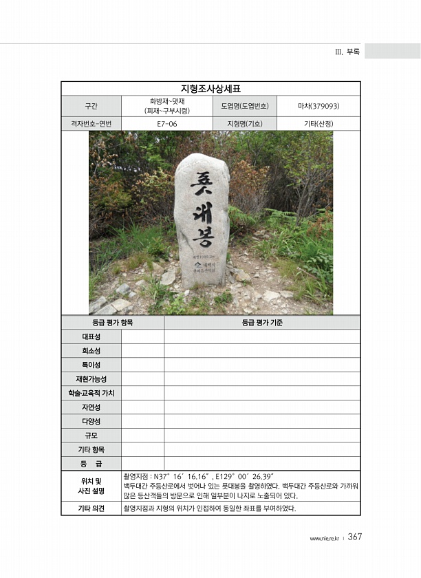 Ⅲ. 부록 www.nie.re.kr ? 367 지형조사상세표 구간 화방재댓재 피재구부시령 도엽명 도엽번호 마차 379093 격자번호-연번 E7-06 지형명 기호 기타 산정 등급 평가 항목 등급 평가 기준 대표성 희소성 특이성 재현가능성 학술?교육적 가치 자연성 다양성 규모 기타 항목 등 급 위치 및 사진 설명 촬영지점 N37°16′16.16″, E129°00′26.39″ 백두대간 주등산로에서 벗어나 있는 푯대봉을 촬영하였다. 백두대간 주등산로와 가까워 많은 등산객들의 방문으로 인해 일부분이 나지로 노출되어 있다. 기타 의견 촬영지점과 지형의 위치가 인접하여 동일한 좌표를부여하였다.
