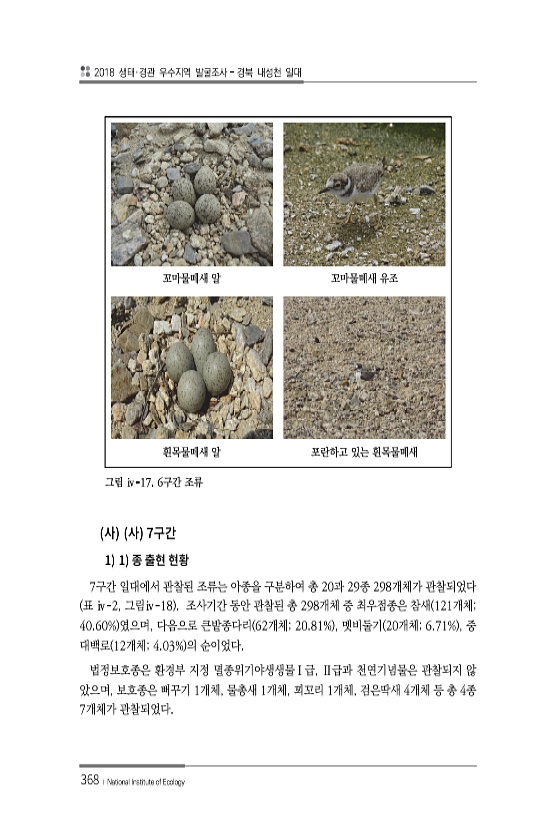 2018 생태·경관 우수지역 발굴조사 경북 내성천 일대 368 ? National Institute of Ecology 꼬마물떼새 알 꼬마물떼새 유조 흰목물떼새 알 포란하고 있는 흰목물떼새 그림 ⅳ-17. 6구간 조류 7 1 1 7구간 일대에서 관찰된 조류는 아종을 구분하여 총 20과 29종 298개체가 관찰되었다 표 ⅳ-2, 그림ⅳ-18 조사기간 동안 관찰된 총 298개체 중 최우점종은 참새 121개체; 40.60% 였으며, 다음으로 큰밭종다리 62개체; 20.81% , 멧비둘기 20개체; 6.71% , 중 대백로 12개체; 4.03% 의 순이었다. 법정보호종은 환경부 지정 멸종위기야생생물Ⅰ급, Ⅱ급과 천연기념물은 관찰되지 않 았으며, 보호종은 뻐꾸기 1개체, 물총새 1개체, 꾀꼬리 1개체, 검은딱새 4개...