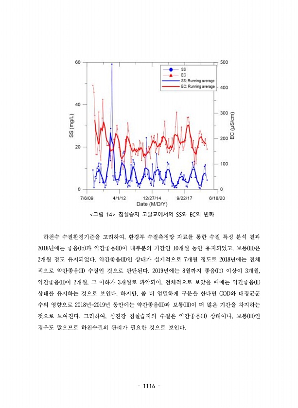 1116 그림 14 침실습지 고달교에서의 SS와 EC의 변화 하천수 수질환경기준을 고려하여, 환경부 수질측정망 자료를 통한 수질 특성 분석 결과 2018년에는 좋음 Ib 과 약간좋음 II 이 대부분의 기간인 10개월 동안 유지되었고, 보통 III 은 2개월 정도 유지되었다. 약간좋음 II 인 상태가 실제적으로 7개월 정도로 2018년에는 전체 적으로 약간좋음 II 수질인 것으로 판단된다. 2019년에는 8월까지 좋음 Ib 이상이 3개월, 약간좋음 II 이 2개월, 그 이하가 3개월로 파악되어, 전체적으로 보았을 때에는 약간좋음 II 상태를 유지하는 것으로 보인다. 하지만, 좀 더 엄밀하게 구분을 한다면 COD와 대장균군 수의 영향으로 2018년-2019년 동안에는 약간좋음 II 과 보통 III 이 더 많은 ...