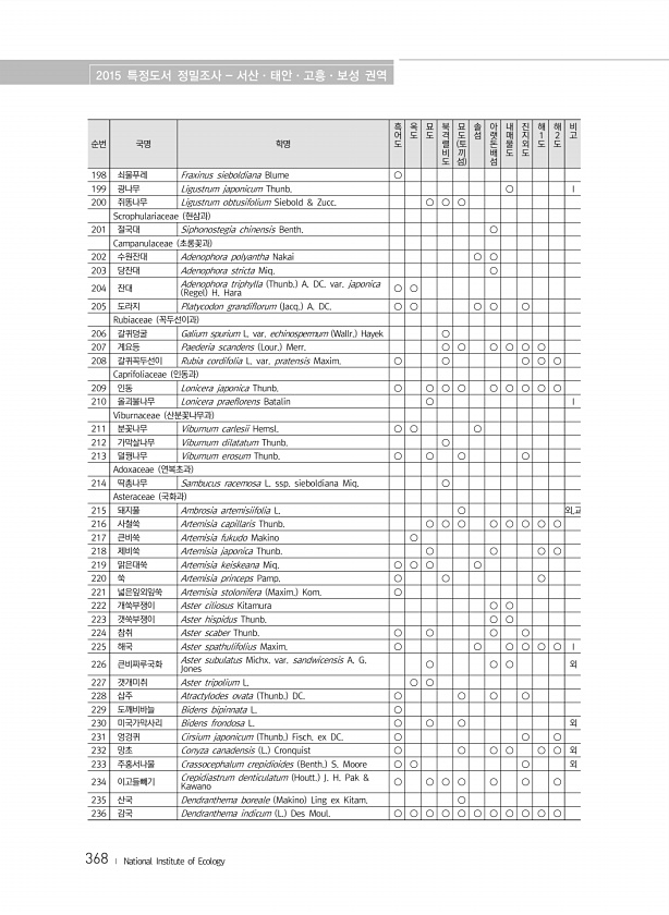 2015 특정도서 정밀조사 서산·태안·고흥·보성 권역 368 ? National Institute of Ecology 순번 국명 학명 흑어도 옥도 묘도 북격렬비도 묘도 토 끼 섬 솔섬 아랫돈배섬 내매물도 진지외도 해1도 해2도 비고 198 쇠물푸레 Fraxinus sieboldiana Blume ○ 199 광나무 Ligustrum japonicum Thunb. ○ Ⅰ 200 쥐똥나무 Ligustrum obtusifolium Siebold & Zucc. ○ ○ ○ Scrophulariaceae 현삼과 201 절국대 Siphonostegia chinensis Benth. ○ Campanulaceae 초롱꽃과 202 수원잔대 Adenophora polyantha Nakai ○ ○ 203 당잔대 Adenophora...