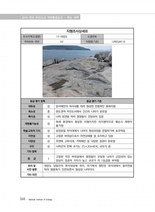 2015 전국 무인도서 자연환경조사 완도 권역 368 ? National Institute of Ecology 지형조사상세표 조사지역 도엽명 15-대망도 도엽번호 격자번호-연번 02 지형명 기호 나마 GM13 등급 평가 항목 등급 평가 기준 대표성 상 암석해안의 파식대를 따라 형성된 전형적인 풍화지형 희소성 중 완도권역 무인도서에서 간간히 나마가 분포함 특이성 상 나마 표면을 따라 염정들이 코팅되어 있음 재현불가능성 상 현재 환경에서 형성된 지형이지만 미지형이므로 훼손시 재현이 불가함 학술?교육적 가치 상 섬장암질 파식대에서 나마의 형성과정을 관찰하기에 효과적임 자연성 상 고립된 바위섬으로서 자연상태를 잘 유지하고 있음 다양성 상 주변에 고파식대, 거력해안 등 다양한 경관이 분포함 규모 상 나마군의 전체 크...