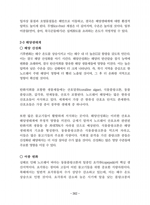 입자상 물질과 오염물질들은 해안으로 이동하고, 결국은 해양생태계에 대한 환경적 압력도 높이게 된다. 무빙 ice-free 계절은 더 길어지며, 수온은 높아질 것이다. 일부 어종들 연어, 송어, 북극곤들매기 은 섭씨20도를 초과하는 온도가 치명적일 수 있다. 2-3 해양생태계 ○ 해양 산성화 기후변화는 해수 온도를 상승시키고 이는 해수 내 더 높은CO2 함량을 갖도록 만든다. 이는 결국 해양 산성화를 야기 시킨다. 해양산성화는 해양의 탄산칼슘 침식 능력에 변화를 초래하며, 결국 탄산석회를 함유한 해양 생물체들에 영향을 미친다. 이는 높은 압력과 낮은 수온을 갖는 심해에서 더 크게 나타난다. 즉, 북극 지역을 중심으로 한 노르웨이 주변 해양이 영향에 더 빨리 노출될 것이며, 그 후 더 온화한 지역으로 영향이 확...
