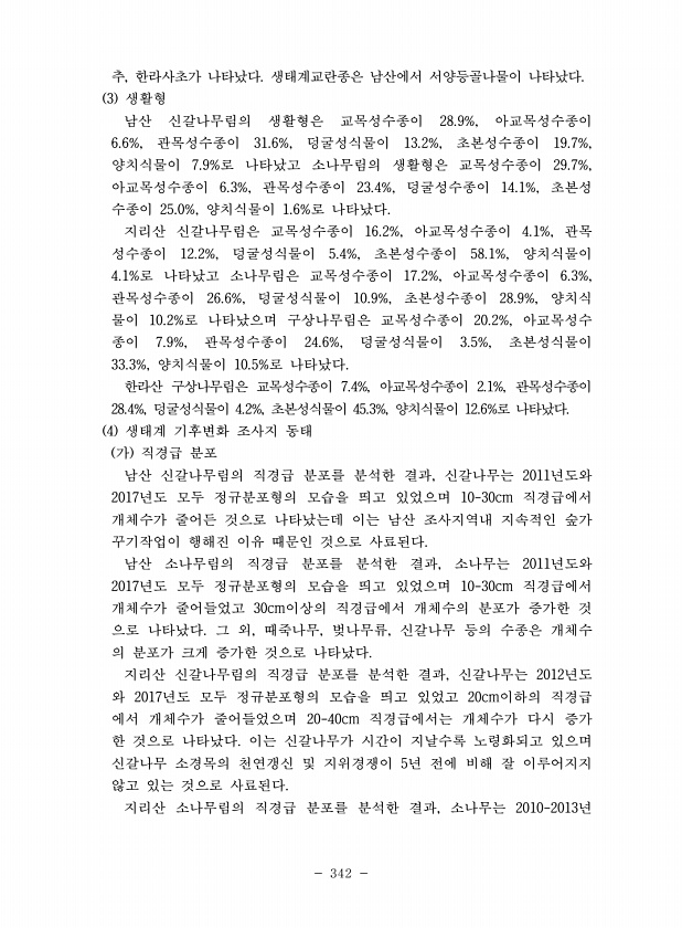 342 추, 한라사초가 나타났다. 생태계교란종은 남산에서 서양등골나물이 나타났다. 3 생활형 남산 신갈나무림의 생활형은 교목성수종이 28.9%, 아교목성수종이 6.6%, 관목성수종이 31.6%, 덩굴성식물이 13.2%, 초본성수종이 19.7%, 양치식물이 7.9%로 나타났고 소나무림의 생활형은 교목성수종이 29.7%, 아교목성수종이 6.3%, 관목성수종이 23.4%, 덩굴성수종이 14.1%, 초본성 수종이 25.0%, 양치식물이 1.6%로 나타났다. 지리산 신갈나무림은 교목성수종이 16.2%, 아교목성수종이 4.1%, 관목 성수종이 12.2%, 덩굴성식물이 5.4%, 초본성수종이 58.1%, 양치식물이 4.1%로 나타났고 소나무림은 교목성수종이 17.2%, 아교목성수종이 6.3%, 관목성수종이 26.6%, ...