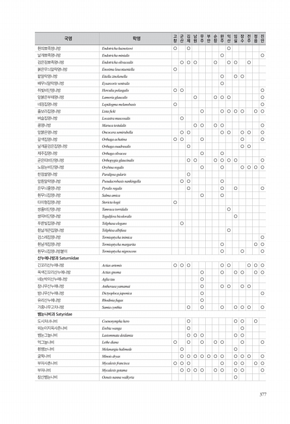 376 제이줄나비 Limenitis doerriesi ○ ○ ○ ○ ○ ○ ○ ○ ○ 제일줄나비 Limenitis helmanni marinus ○ ○ ○ 참줄나비 Limenitis moltrechti ○ 굵은줄나비 Limenitis sydyi ○ ○ ○ 은판나비 Mimathyma schrenckii ○ ○ ○ 구름표범나비 Nephargynnis anadyomene ○ ○ ○ 왕세줄나비 Neptis alwina ○ ○ ○ ○ 참세줄나비 Neptis philyroides ○ ○ ○ ○ 별박이세줄나비 Neptis pryeri ○ ○ ○ ○ ○ ○ ○ ○ ○ ○ 두줄나비 Neptis rivularis ○ ○ ○ ○ 애기세줄나비 Neptis sappho ○ ○ ○ ○ ○ ○ ○ ○ ○ ○ ○ ○ ○ ○ 높은산세줄나...