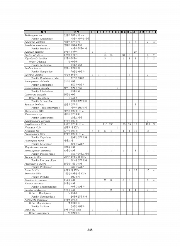 학 명 국 명 1-1 1-2 1-3 1-4 2-2 2-3 2-4 3-1 3-2 3-3 3-4 Rhithrogena na 산납작하루살이 na Family Ameletidae 피라미하루살이과 Ameletus costalis 피라미하루살이 2 6 7 10 Ameletus montanus 멧피라미하루살이 Family Baetidae 꼬마하루살이과 Alanites muticus 길쭉하루살이 3 1 27 Baetis silvaticus 감초하루살이 15 38 38 8 3 7 Nigrobaetis bacillus 깜장하루살이 3 1 1 1 ...