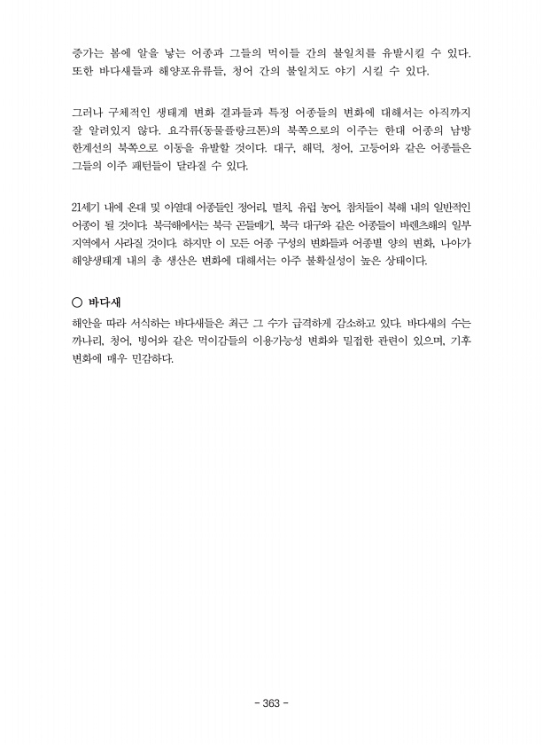 증가는 봄에 알을 낳는 어종과 그들의 먹이들 간의 불일치를 유발시킬 수 있다. 또한 바다새들과 해양포유류들, 청어 간의 불일치도 야기 시킬 수 있다. 그러나 구체적인 생태계 변화 결과들과 특정 어종들의 변화에 대해서는 아직까지 잘 알려있지 않다. 요각류 동물플랑크톤 의 북쪽으로의 이주는 한대 어종의 남방 한계선의 북쪽으로 이동을 유발할 것이다. 대구, 해덕, 청어, 고등어와 같은 어종들은 그들의 이주 패턴들이 달라질 수 있다. 21세기 내에 온대 및 아열대 어종들인 정어리, 멸치, 유럽 농어, 참치들이 북해 내의 일반적인 어종이 될 것이다. 북극해에서는 북극 곤들매기, 북극 대구와 같은 어종들이 바렌츠해의 일부 지역에서 사라질 것이다. 하지만 이 모든 어종 구성의 변화들과 어종별 양의 변화, 나아가 해양생태...