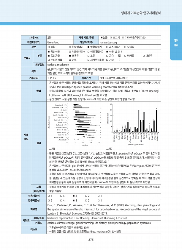 375 생태계 기후변화 연구사례분석 통 합 사례 No. 299 사례 자료 유형 ■논문 □ 보고서 □ 기타 학술/기사자료 대상지 국가 Greenland 대상지 지역 Kangerlussuaq 부문 □ 통합 □ 취약성평가 ■ 영향성평가 □ 리스크평가 □ 모델링 분류군 부문 ■ 육상식물 □ 식물 침엽수 □ 식물 활엽수 ■ 식물 초 본 ■ 육상동물 ■ 포유류 □ 조류 □ 곤충 류 □ 양서류 □ 파충류 □ 수상동식물 □ 어류 □ 저서무척추류 □ 기타 세부정보 caribou, muskoxen 목적 온난화와 식물의 생물기후의 공간 역학 사이의 관계를 밝히고 온난화와 초식동물의 생산성에 대한 식물의 생물 계절 공간 역학 사이의 관계를 검토하기 위함 기후인자 T, P, Ev 자료기간 plot 조사 1994,2002-2007 ...