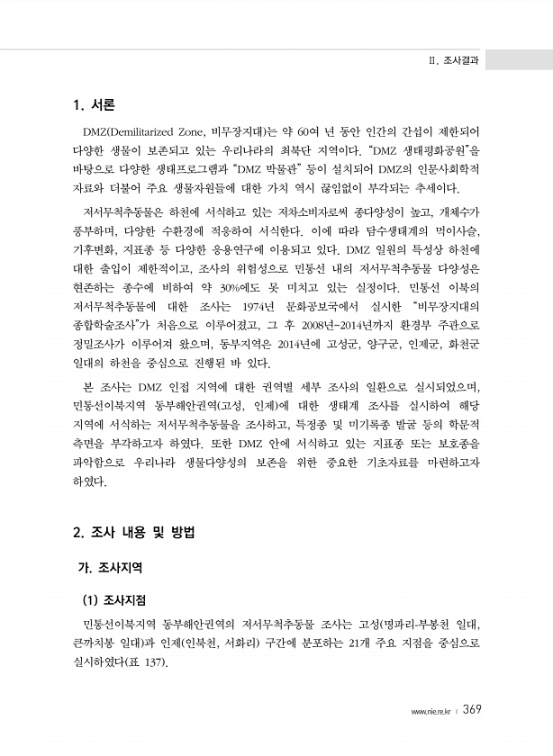 Ⅱ. 조사결과 www.nie.re.kr ? 369 1. 서론 DMZ Demilitarized Zone, 비무장지대 는 약 60여 년 동안 인간의 간섭이 제한되어 다양한 생물이 보존되고 있는 우리나라의 최북단 지역이다. “DMZ 생태평화공원”을 바탕으로 다양한 생태프로그램과 “DMZ 박물관” 등이 설치되어 DMZ의 인문사회학적 자료와 더불어 주요 생물자원들에 대한 가치 역시 끊임없이 부각되는 추세이다. 저서무척추동물은 하천에 서식하고 있는 저차소비자로써 종다양성이 높고, 개체수가 풍부하며, 다양한 수환경에 적응하여 서식한다. 이에 따라 담수생태계의 먹이사슬, 기후변화, 지표종 등 다양한 응용연구에 이용되고 있다. DMZ 일원의 특성상 하천에 대한 출입이 제한적이고, 조사의 위험성으로 민통선 내의 저서무척추동물...