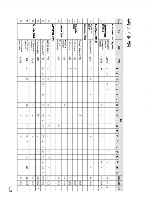 353 번호 과명 학명 국명 문헌 합계 비율 비고 1 2 3 4 5 6 7 8 9 10 11 12 13 14 15 16 17 18 19 20 21 Petromyzontiformes 칠성장어목 1 Petromyzonidae 칠성장어과 Lethenteron japonicus 칠성장어 ○ ○ ○ 23 1 1 14 39 0.042 멸Ⅱ 2 Lethenteron reissneri 다묵장어 185 21 1 73 1 1 344 2 628 0.683 멸Ⅱ Anguilliformes 뱀장어목 3 Anguillidae 뱀장어과 Anguilla japonica 뱀장어 74 ○ 1 5 5 1 86 0.094 Clupeiformes 청어목 4 Engraulidae 멸치과 Engraulis japonicus 멸치 1 1 0.001 ...