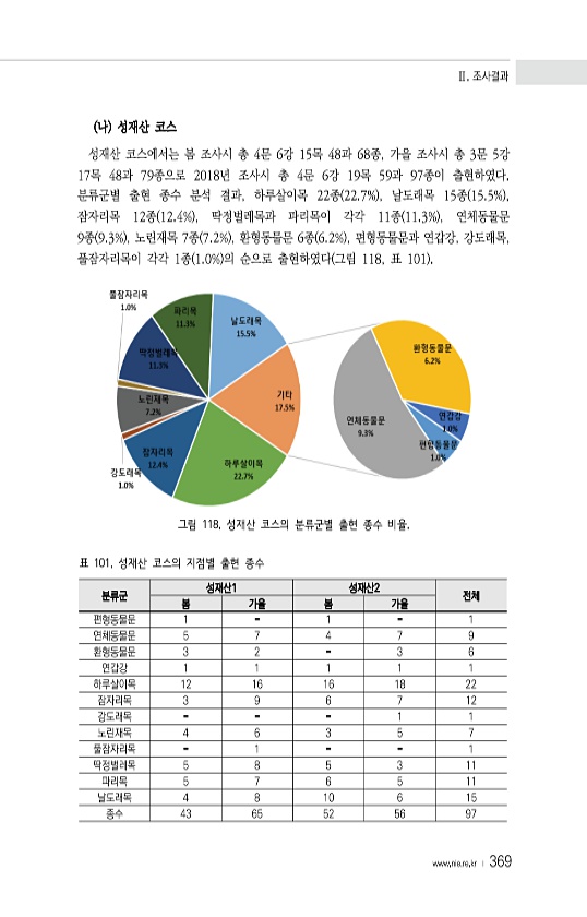 Ⅱ. 조사결과 www.nie.re.kr ? 369 나 성재산 코스 성재산 코스에서는 봄 조사시 총 4문 6강 15목 48과 68종, 가을 조사시 총 3문 5강 17목 48과 79종으로 2018년 조사시 총 4문 6강 19목 59과 97종이 출현하였다. 분류군별 출현 종수 분석 결과, 하루살이목 22종 22.7% , 날도래목 15종 15.5% , 잠자리목 12종 12.4% , 딱정벌레목과 파리목이 각각 11종 11.3% , 연체동물문 9종 9.3% , 노린재목 7종 7.2% , 환형동물문 6종 6.2% , 편형동물문과 연갑강, 강도래목, 풀잠자리목이 각각 1종 1.0% 의 순으로 출현하였다 그림 118, 표 101 그림 118. 성재산 코스의 분류군별 출현 종수 비율. 분류군 성재산1 성재산2 전체 봄 가을 ...