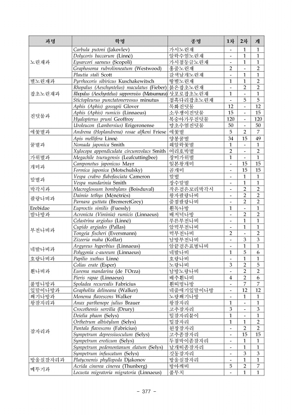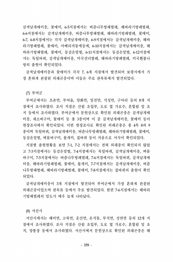 359 갈색날개매미충, 꽃매미, 6-5지점에서는 버즘나무방패벌레, 해바라기방패벌레, 6-6지점에서는 갈색날개매미충, 버즘나무방패벌레, 해바라기방패벌레, 꽃매미, 6-7, 6-8지점에서는 각각 갈색날개매미충, 6-9지점에서는 갈색날개매미충, 해바 라기방패벌레, 꽃매미, 아메리카동애등에, 6-10지점에서는 갈색날개매미충, 해 바라기방패벌레, 꽃매미, 등검은말벌, 6-11지점에서는 등검은말벌, 6-12지점에 서는 독일바퀴, 갈색날개매미충, 미국선녀벌레, 해바라기방패벌레, 미국흰불나 방의 출현이 확인되었다. 갈색날개매미충과 꽃매미가 각각 7, 6개 지점에서 발견되어 보령시에서 가 장 흔하게 관찰된 외래곤충이며 이들은 주로 관목류에서 발견되었다. 7 부여군 부여군에서는 초촌면, 부여읍, 양화면, 임천면, 석성면, 구...