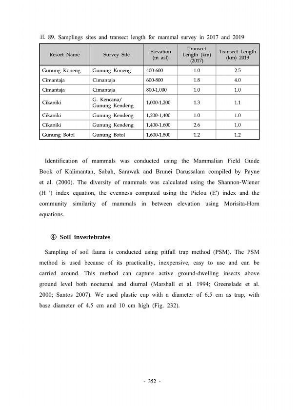 352 89. Samplings sites and transect length for mammal survey in 2017 and 2019 Resort Name Survey Site Elevation m asl Transect Length km 2017 Transect Length km 2019 Gunung Koneng Gunung Koneng 400-600 1.0 2.5 Cimantaja Cimantaja 600-800 1.8 4.0 Cimantaja Cimantaja 800-1,000 1.0 1.0 Cikaniki G. Kencana/ Gunung Kendeng 1,000-1,200 1.3 1.1 Cikaniki Gunung Kendeng 1,200-1,400 1.0 1.0 Cikaniki Gunung...