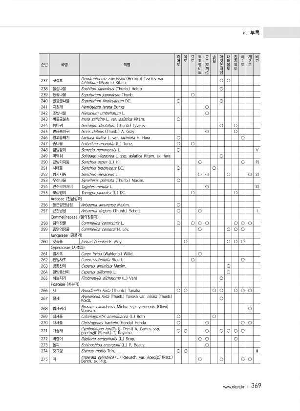Ⅴ. 부록 www.nie.re.kr ? 369 순번 국명 학명 흑어도 옥도 묘도 북격렬비도 묘도 토 끼 섬 솔섬 아랫돈배섬 내매물도 진지외도 해1도 해2도 비고 237 구절초 Dendranthema zawadskii Herbich Tzvelev var. latilobum Maxim. Kitam. ○ ○ 238 풀솜나물 Euchiton japonicus Thunb. Holub ○ 239 등골나물 Eupatorium japonicum Thunb. ○ 240 골등골나물 Eupatorium lindleyanum DC. ○ ○ 241 지칭개 Hemistepta lyrata Bunge ○ 242 조밥나물 Hieracium umbellatum L. ○ 243 버들금불초 Inula salicina L. var. asiat...