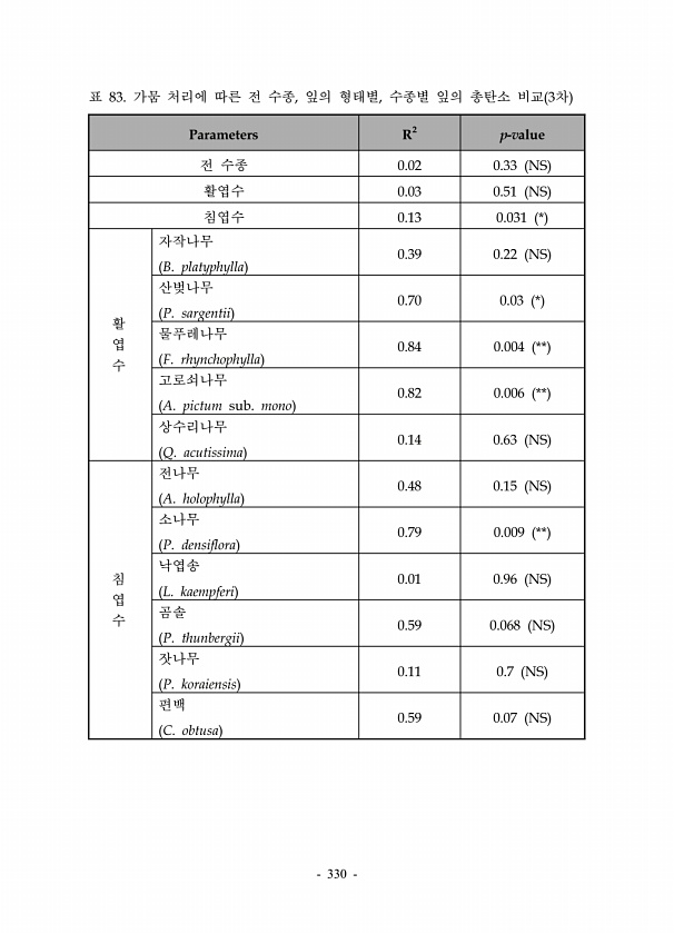 330 Parameters R2 p-value 전 수종 0.02 0.33 NS 활엽수 0.03 0.51 NS 침엽수 0.13 0.031 * 활 엽 수 자작나무 B. platyphylla 0.39 0.22 NS 산벚나무 P. sargentii 0.70 0.03 * 물푸레나무 F. rhynchophylla 0.84 0.004 ** 고로쇠나무 A. pictum sub. mono 0.82 0.006 ** 상수리나무 Q. acutissima 0.14 0.63 NS 침 엽 수 전나무 A. holophylla 0.48 0.15 NS 소나무 P. densiflora 0.79 0.009 ** 낙엽송 L. kaempferi 0.01 0.96 NS 곰솔 P. thunbergii 0.59 0.068 NS 잣나무 P. koraie...