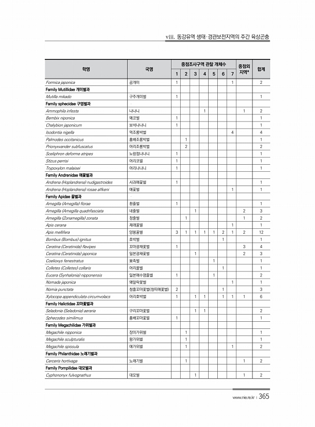 viii. 동강유역 생태·경관보전지역의 주간 육상곤충 www.nie.re.kr ?365 학명 국명 중점조사구역 관찰 개체수 중점외 1 2 3 4 5 6 7 지역* 합계 Formica japonica 곰개미 1 1 2 Family Mutillidae 개미벌과 Mutilla mikado 구주개미벌 1 1 Family sphecidae 구멍벌과 Ammophila infesta 나나니 1 1 2 Bembix niponica 왜코벌 1 1 Chalybion japonicum 보석나나니 1 1 Isodontia nigella 먹조롱박벌 4 4 Palmodes occitanicus 홍배조롱박벌 1 1 Prionyxvander subfuscatus 어리조롱박벌 2 2 Sceliphron deforme atripes 노랑점...