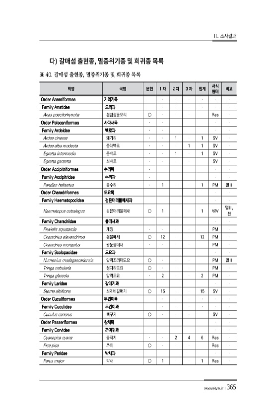 II. 조사결과 www.nie.re.kr ?365 , 학명 국명 문헌 1 차 2 차 3 차 합계 서식 형태 비고 Order Anseriformes 기러기목 Family Anatidae 오리과 Anas poecilorhyncha 흰뺨검둥오리 ○ Res Order Pelecaniformes 사다새목 Family Ardeidae 백로과 Ardea cinerea 왜가리 1 1 SV Ardea alba modesta 중대백로 1 1 SV Egretta intermedia 중백로 1 1 SV Egretta garzetta 쇠백로 SV Order Accipitriformes 수리목 Family Accipitridae 수리과 Pandion hali...