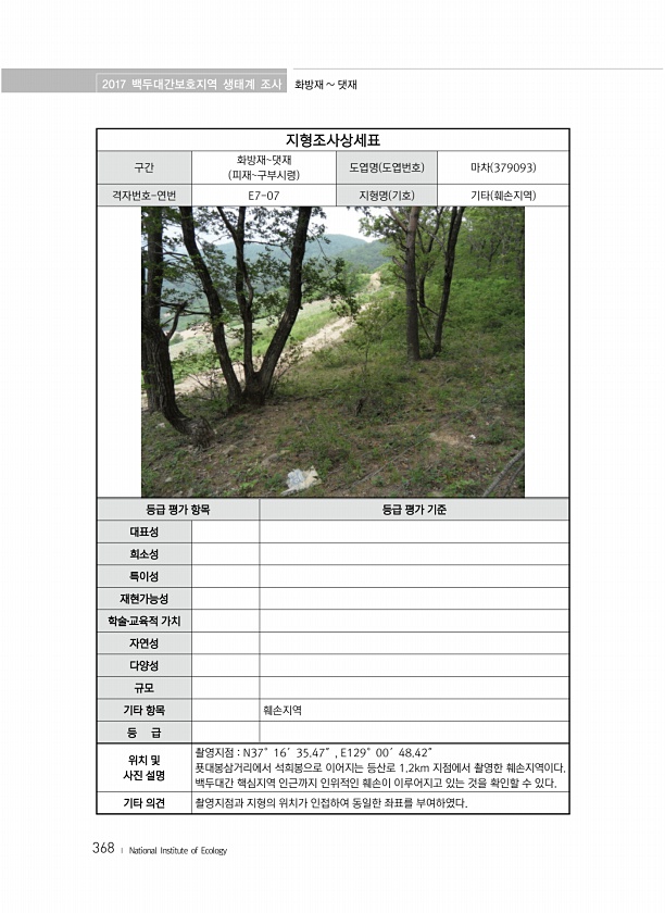 2017 백두대간보호지역 생태계 조사 화방재 댓재 368 ? National Institute of Ecology 지형조사상세표 구간 화방재댓재 피재구부시령 도엽명 도엽번호 마차 379093 격자번호-연번 E7-07 지형명 기호 기타 훼손지역 등급 평가 항목 등급 평가 기준 대표성 희소성 특이성 재현가능성 학술?교육적 가치 자연성 다양성 규모 기타 항목 훼손지역 등 급 위치 및 사진 설명 촬영지점 N37°16′35.47″, E129°00′48.42″ 푯대봉삼거리에서 석희봉으로 이어지는 등산로 1.2km 지점에서 촬영한 훼손지역이다. 백두대간 핵심지역 인근까지 인위적인 훼손이 이루어지고 있는 것을 확인할 수 있다. 기타 의견 촬영지점과 지형의 위치가 인접하여 동일한 좌표를부여하였다.