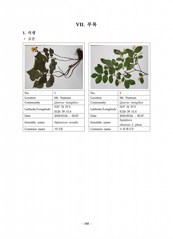 348 VII. 부록 1. 식생 ? 표본 No. 1 No. 2 Location Mt. Namsan Location Mt. Namsan Community Quercus mongolica Community Quercus mongolica Latitude/Longitude N37 32 57.5 E126 59 11.4 Latitude/Longitude N37 32 57.5 E126 59 11.4 Date 2018.05.04. 05.07. Date 2018.05.04. 05.07. Scientific name Hylomecon vernalis Scientific name Symplocos chinensis f. pilosa Common name 피나물 Common name노린재나무