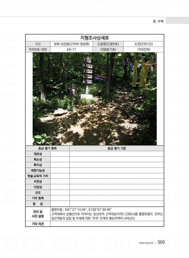 Ⅲ. 부록 www.nie.re.kr ? 369 지형조사상세표 구간 댓재삽당령 고적대원방재 도엽명 도엽번호 도전 378122 격자번호-연번 E6-17 지형명 기호 기타 안부 등급 평가 항목 등급 평가 기준 대표성 희소성 특이성 재현가능성 학술?교육적 가치 자연성 다양성 규모 기타 항목 등 급 위치 및 사진 설명 촬영지점 N37°27′14.94″, E128°57′49.96″ 고적대에서 상월산으로 이어지는 등산로의 고적대삼거리 1,230m 를 촬영하였다. 안부는 등산객들의 답압 및 우세에 의한 ‘주의’ 단계의 훼손지역이 나타난다. 기타의견