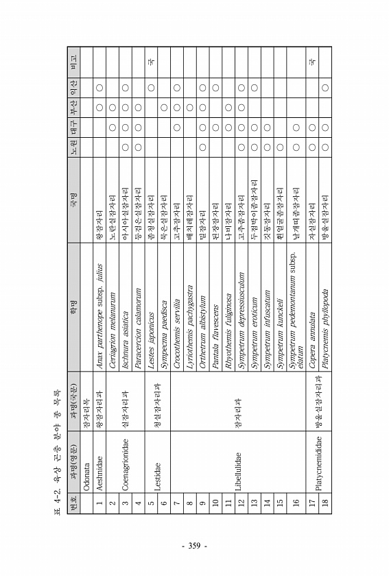 번호 과명 영문 과명 국문 학명 국명 노원 대구 부산 익산 비고 Odonata 잠자리목 1 Aeshnidae 왕잠자리과 Anax parthenope subsp. julius 왕잠자리 ○ ○ 2 Coenagrionidae 실잠자리과 Ceriagrion melanurum 노란실잠자리 ○ ○ 3 Ischnura asiatica 아시아실잠자리 ○ ○ ○ ○ 4 Paracercion calamorum 등검은실잠자리 ○ ○ ○ 5 Lestidae 청실잠자리과 Lestes japonicus 좀청실잠자리 ○ 국 6 Sympecma paedisca 묵은실잠자리 ○ 7 Libellulidae 잠자리과 Crocothemis servilia 고추잠자리 ○ ○ ○ 8 Lyriothemis pachygastra 배치레잠자리 ○ 9 ...