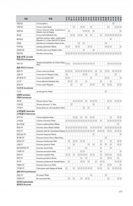 375 쥐털이슬 Circaea alpina L. ○ 쇠털이슬 Circaea cordata Royle ○ ○ ○ ○ ○ ○ ○ ○ 말털이슬 Circaea lutetiana subsp. quadrisulcata Maxim. Asch. & Magnus ○ ○ ○ ○ ○ ○ 털이슬 Circaea mollis Siebold & Zucc. ○ ○ ○ ○ ○ ○ ○ ○ ○ ○ ○ ○ ○ ○ 돌바늘꽃 Epilobium amurense subsp. cephalostigma Hausskn. C. J. Chen, Hoch & P. H. Raven ○ 바늘꽃 Epilobium pyrricholophum Franch. & Sav. ○ ○ ○ 여뀌바늘 Ludwigia epilobioides Maxim. ○ ○ ○ ○ ○ ○ ○ ○ ...