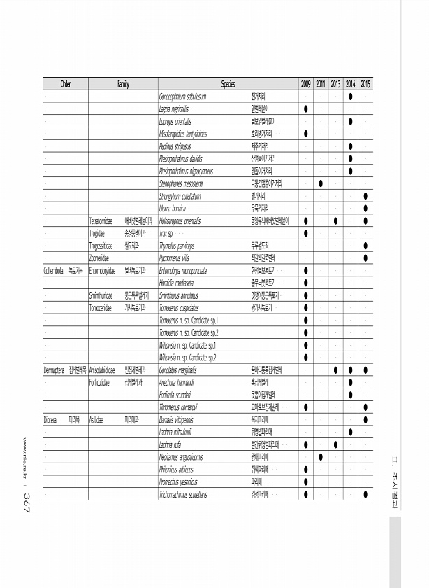 367 Order Family Species 2009 2011 2013 2014 2015 Gonocephalum sabulosum 진거저리 ● Lagria nigricollis 잎벌레붙이 ● Luprops orientalis 털보잎벌레붙이 ● Misolampidius tentyrioides 호리병거저리 ● Pedinus strigosus 제주거저리 ● Plesiophthalmus davidis 산맴돌이거저리 ● Plesiophthalmus nigrocyaneus 맴돌이거저리 ● Stenophanes mesostena 극동긴맴돌이거저리 ● Strongylium cutellatum 별거저리...