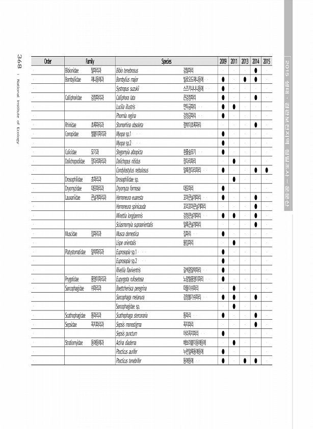 368 Order Family Species 2009 2011 2013 2014 2015 Bibionidae 털파리과 Bibio tenebrosus 검털파리 ● Bombyliidae 재니등에과 Bombylius major 빌로오도재니등에 ● ● ● Systropus suzukii 스즈키나나니등에 ● Calliphoridae 검정파리과 Calliphora lata 큰검정파리 ● ● Lucilia illustris 연두금파리 ● ● Phormia regina 검정금파리 ● Rhinidae 초록파리과 Stomorhina obsoleta 점박이초록파리 ● Conopidae 벌붙이파리과 Myop...