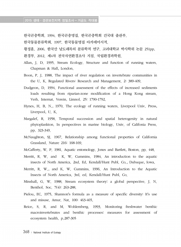 2015 생태·경관보전지역 정밀조사 거금도 적대봉 368 ? National Institute of Ecology 한국곤충학회. 1994. 한국곤충명집. 한국곤충학회 건국대 출판부. 한국동물분류학회. 1997. 한국동물명집 아카데미서적. 황정훈. 2006. 한국산 날도래목의 분류학적 연구. 고려대학교 박사학위 논문 251pp. 환경부. 2012. 제4차 전국자연환경조사 지침. 국립환경과학원. Allan, J. D. 1995. Stream Ecology. Structure and function of running waters. Chapman & Hall, London. Boon, P. J. 1988. The impact of river regulation on invertebrate communities i...