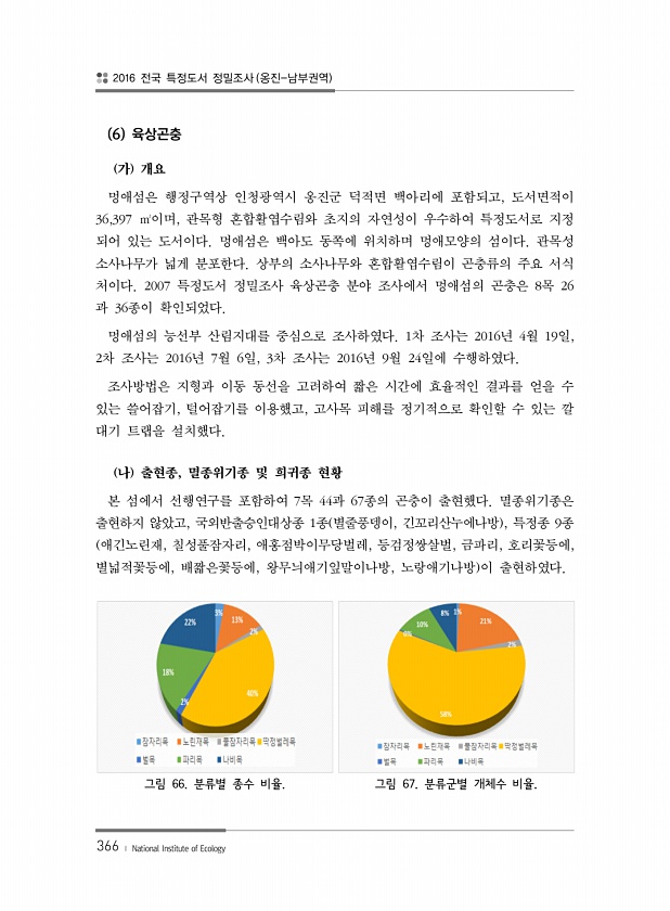 2016 전국 특정도서 정밀조사 옹진-남부권역 366 ? National Institute of Ecology 6 육상곤충 가 개요 멍애섬은 행정구역상 인청광역시 옹진군 덕적면 백아리에 포함되고, 도서면적이 36,397 ㎡이며, 관목형 혼합활엽수림와 초지의 자연성이 우수하여 특정도서로 지정 되어 있는 도서이다. 멍애섬은 백아도 동쪽에 위치하며 멍애모양의 섬이다. 관목성 소사나무가 넓게 분포한다. 상부의 소사나무와 혼합활엽수림이 곤충류의 주요 서식 처이다. 2007 특정도서 정밀조사 육상곤충 분야 조사에서 멍애섬의 곤충은 8목 26 과 36종이 확인되었다. 멍애섬의 능선부 산림지대를 중심으로 조사하였다. 1차 조사는 2016년 4월 19일, 2차 조사는 2016년 7월 6일, 3차 조사는 2016년 9월 24...