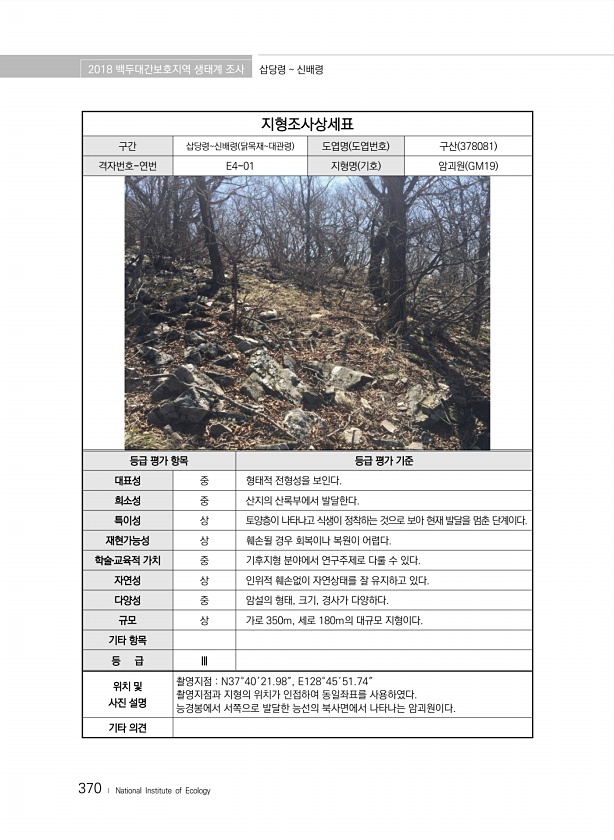 2018 백두대간보호지역 생태계 조사 삽당령 신배령 370 ? National Institute of Ecology 지형조사상세표 구간 삽당령신배령 닭목재대관령 도엽명 도엽번호 구산 378081 격자번호-연번 E4-01 지형명 기호 암괴원 GM19 등급 평가 항목 등급 평가 기준 대표성 중 형태적 전형성을 보인다. 희소성 중 산지의 산록부에서 발달한다. 특이성 상 토양층이 나타나고 식생이 정착하는 것으로 보아 현재 발달을 멈춘 단계이다. 재현가능성 상 훼손될 경우 회복이나 복원이 어렵다. 학술?교육적 가치 중 기후지형 분야에서 연구주제로 다룰 수 있다. 자연성 상 인위적 훼손없이 자연상태를 잘 유지하고 있다. 다양성 중 암설의 형태, 크기, 경사가 다양하다. 규모 상 가로 350m, 세로 180m의 대규모 ...