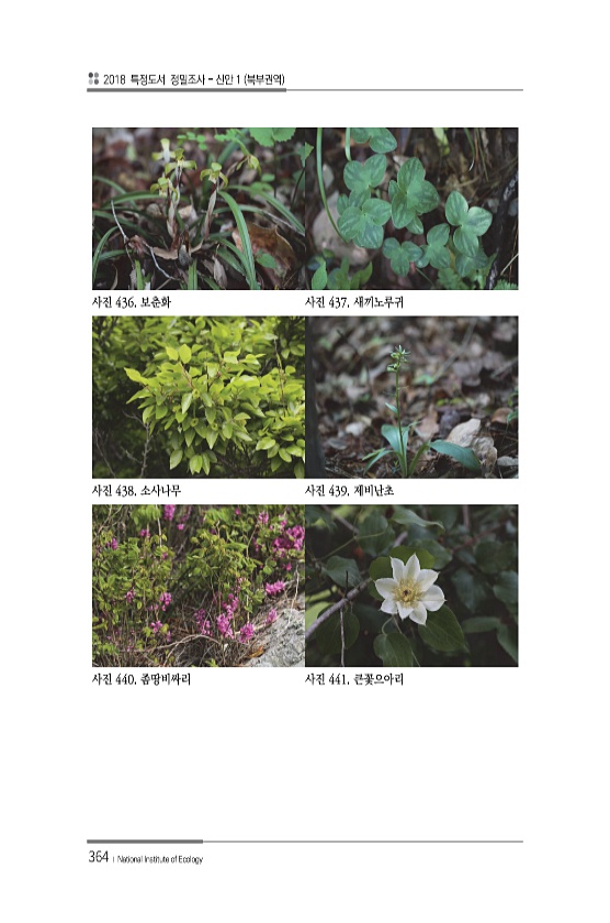 2018 특정도서 정밀조사 신안 1 북부권역 364 ? National Institute of Ecology 사진 436. 보춘화 사진 437. 새끼노루귀 사진 438. 소사나무 사진 439. 제비난초 사진 440. 좀땅비싸리 사진 441.큰꽃으아리