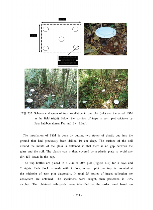 353 232. Schematic diagram of trap installation in one plot left and the actual PSM in the field right Belowthe position of traps in each plot pictures by Fata habibburahman Faz and Ewi Irfani The installation of PSM is done by putting two stacks of plastic cup into the ground that had previously been drilled 10 cm deep. The surface of the soil around the mouth of the glass is flattened so that th...