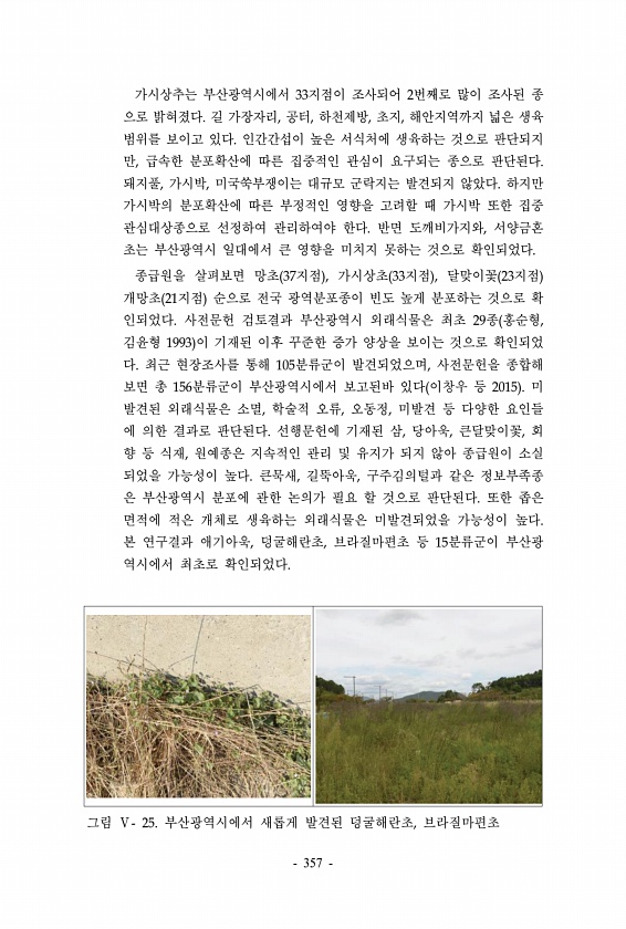 가시상추는 부산광역시에서 33지점이 조사되어 2번째로 많이 조사된 종 으로 밝혀졌다. 길 가장자리, 공터, 하천제방, 초지, 해안지역까지 넓은 생육 범위를 보이고 있다. 인간간섭이 높은 서식처에 생육하는 것으로 판단되지 만, 급속한 분포확산에 따른 집중적인 관심이 요구되는 종으로 판단된다. 돼지풀, 가시박, 미국쑥부쟁이는 대규모 군락지는 발견되지 않았다. 하지만 가시박의 분포확산에 따른 부정적인 영향을 고려할 때 가시박 또한 집중 관심대상종으로 선정하여 관리하여야 한다. 반면 도깨비가지와, 서양금혼 초는 부산광역시 일대에서 큰 영향을 미치지 못하는 것으로 확인되었다. 종급원을 살펴보면 망초 37지점 , 가시상초 33지점 , 달맞이꽃 23지점 개망초 21지점 순으로 전국 광역분포종이 빈도 높게 분포하는 것으로...