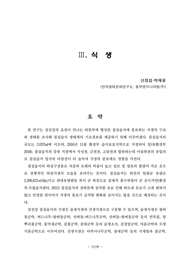 1119 Ⅲ. 식 생 신정섭·박재웅 한국생태문화연구소, 동부엔지니어링 주 요 약 본 연구는 섬진강과 요천이 만나는 하류부에 형성된 침실습지에 분포하는 식생의 구조 와 생태를 조사해 침실습지 생태계의 기초정보를 제공하기 위해 이루어졌다. 침실습지의 규모는 2.037㎢에 이르며, 2016년 11월 환경부 습지보호지역으로 지정되어 있다 환경부 2018 침실습지의 중류 지점에서 곡성천, 금천천, 고달천과 합류하는데 이들하천의 유입의 로 침실습지 입지의 다양성이 더 높아져 식생의 분포에도 영향을 미친다. 침실습지의 하상구성물은 자갈과 모래의 비율이 높고 실트 및 점토의 함량이 적은 곳으 로 전형적인 하천식생의 모습을 보여주는 곳이다. 침실습지는 하천의 일평균 유량은 2,390,622㎥/day이고 최대유량변동 폭이 큰...