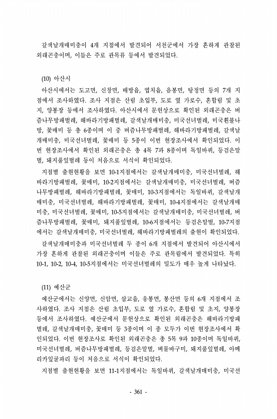 361 갈색날개매미충이 4개 지점에서 발견되어 서천군에서 가장 흔하게 관찰된 외래곤충이며, 이들은 주로 관목류 등에서 발견되었다. 10 아산시 아산시에서는 도고면, 신창면, 배방읍, 엽치읍, 음봉면, 탕정면 등의 7개 지 점에서 조사하였다. 조사 지점은 산림 초입부, 도로 옆 가로수, 혼합림 및 초 지, 양봉장 등에서 조사하였다. 아산시에서 문헌상으로 확인된 외래곤충은 버 즘나무방패벌레, 해바라기방패벌레, 갈색날개매미충, 미국선녀벌레, 미국흰불나 방, 꽃매미 등 총 6종이며 이 중 버즘나무방패벌레, 해바라기방패벌레, 갈색날 개매미충, 미국선녀벌레, 꽃매미 등 5종이 이번 현장조사에서 확인되었다. 이 번 현장조사에서 확인된 외래곤충은 총 4목 7과 8종이며 독일바퀴, 등검은말 벌, 돼지풀잎벌레 등이 처음으로 ...