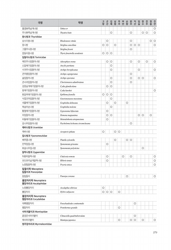 379 물결뾰족날개나방 Tethea or ○ 무늬뾰족날개나방 Thyatira batis ○ ○ ○ ○ ○ 창나방과 Thyrididae 상수리창나방 Rhodoneura vittula ○ ○ ○ ○ 창나방 Striglina cancellata ○ ○ ○ ○ ○ ○ ○ 그물무늬창나방 Striglina fxseni ○ 깜둥이창나방 Thyris fenestrella seoulensis ○ ○ ○ 잎말이나방과 Tortricidae 애모무늬잎말이나방 Adoxophyes orana ○ ○ ○ ○ ○ ○ 신갈애기잎말이나방 Ancylis partitana ○ 사과무늬잎말이나방 Archips breviplicanus ○ ○ ○ 큰주름잎말이나방 Archips capsigeranus ○ 솔잎말이나방 Archips oporanus ...