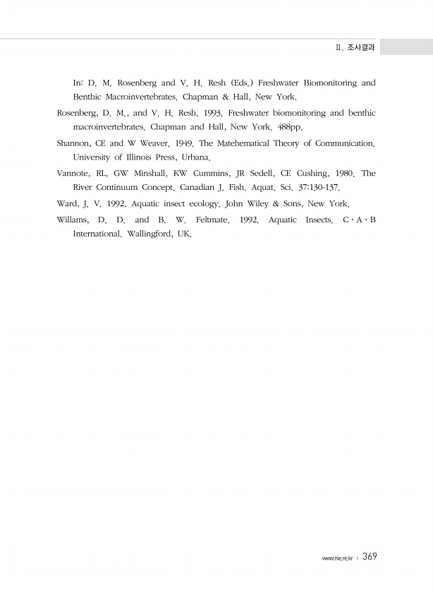 Ⅱ. 조사결과 www.nie.re.kr ? 369 InD. M. Rosenberg and V. H. Resh Eds. Freshwater Biomonitoring and Benthic Macroinvertebrates. Chapman & Hall, New York. Rosenberg, D. M., and V. H. Resh. 1993. Freshwater biomonitoring and benthic macroinvertebrates. Chapman and Hall, New York. 488pp. Shannon, CE and W Weaver. 1949. The Matehematical Theory of Communication. University of Illinois Press, Urbana. Vannot...