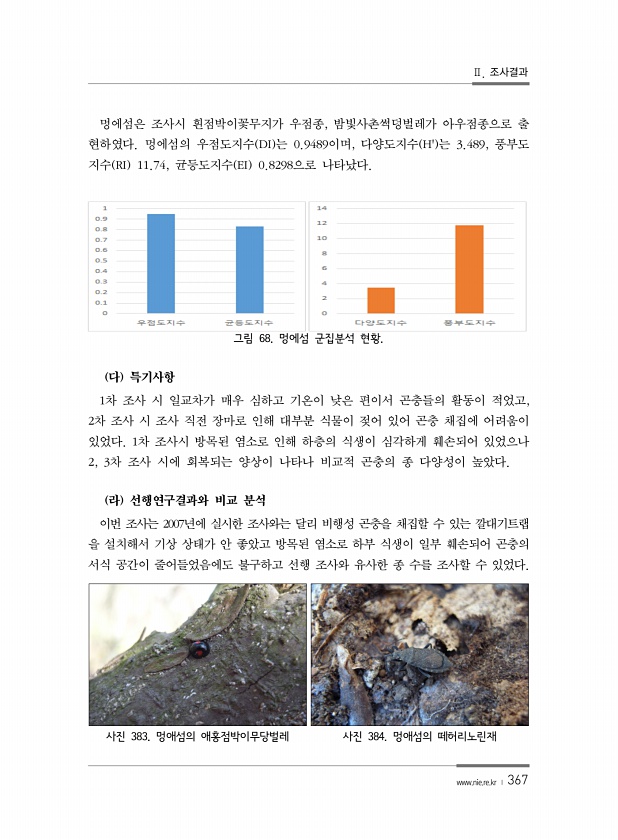Ⅱ. 조사결과 www.nie.re.kr ? 367 멍에섬은 조사시 흰점박이꽃무지가 우점종, 밤빛사촌썩덩벌레가 아우점종으로 출 현하였다. 멍에섬의 우점도지수 DI 는 0.9489이며, 다양도지수 H는 3.489, 풍부도 지수 RI 11.74, 균등도지수 EI 0.8298으로 나타났다. 그림 68. 멍에섬 군집분석 현황. 다 특기사항 1차 조사 시 일교차가 매우 심하고 기온이 낮은 편이서 곤충들의 활동이 적었고, 2차 조사 시 조사 직전 장마로 인해 대부분 식물이 젖어 있어 곤충 채집에 어려움이 있었다. 1차 조사시 방목된 염소로 인해 하층의 식생이 심각하게 훼손되어 있었으나 2, 3차 조사 시에 회복되는 양상이 나타나 비교적 곤충의 종 다양성이 높았다. 라 선행연구결과와 비교 분석 이번 조사는 2007년에 실...