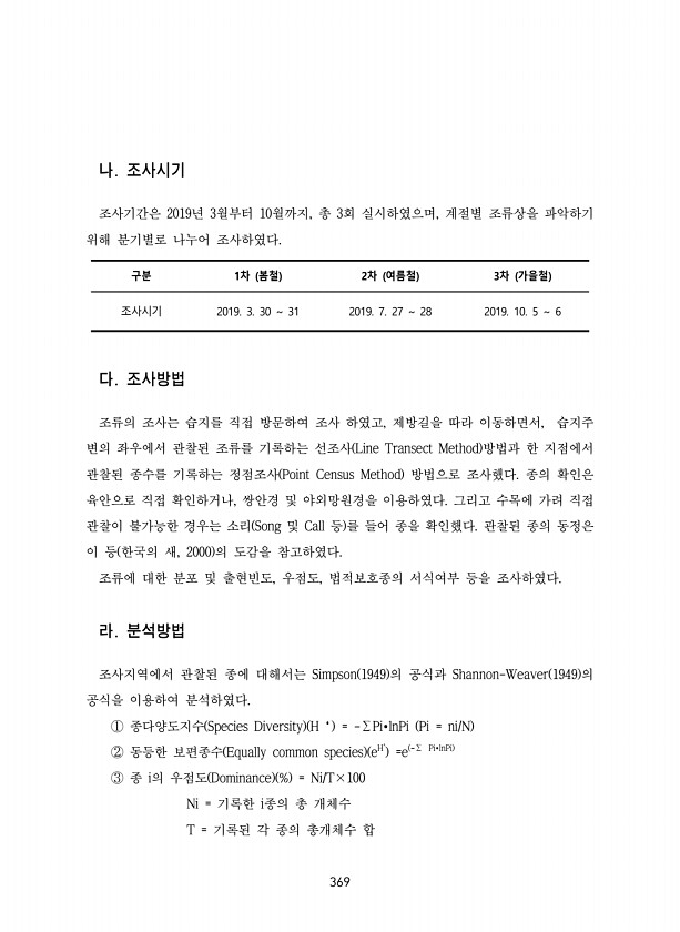 369 나. 조사시기 조사기간은 2019년 3월부터 10월까지, 총 3회 실시하였으며, 계절별 조류상을 파악하기 위해 분기별로 나누어 조사하였다. 구분 1차 봄철 2차 여름철 3차 가을철 조사시기 2019. 3. 30 31 2019. 7. 27 28 2019. 10. 5 6 다. 조사방법 조류의 조사는 습지를 직접 방문하여 조사 하였고, 제방길을 따라 이동하면서, 습지주 변의 좌우에서 관찰된 조류를 기록하는 선조사 Line Transect Method 방법과 한 지점에서 관찰된 종수를 기록하는 정점조사 Point Census Method 방법으로 조사했다. 종의 확인은 육안으로 직접 확인하거나, 쌍안경 및 야외망원경을 이용하였다. 그리고 수목에 가려 직접 관찰이 불가능한 경우는 소리 Song 및 Call 등...