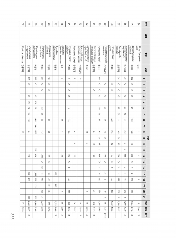 355 번호 과명 학명 국명 문헌 합계 비율 비고 1 2 3 4 5 6 7 8 9 10 11 12 13 14 15 16 17 18 19 20 21 34 Microphysogobio jeoni 경모치 2 1 1 2 6 0.007 고 35 Microphysogobio yaluensis 돌마자 194 ○ ○ ○ 23 350 168 19 280 ○ 3 2 339 586 1,964 2.136 고 36 Microphysogobio longidorsalis 배가사리 78 ○ ○ 37 13 2 212 3 3 968 2 15 46 212 8 1,599 1.739 고 37 Pseudogobio esocinus 모래무지 54 ○ ○ ○ 97 56 151 149 ○ 50 376 ○ 31 11 127 604 2 1,708 1.85...