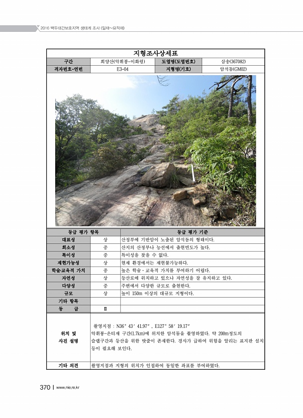 2016 백두대간보호지역 생태계 조사 밀재묘적재 370Ⅰwww.nie.re.kr 지형조사상세표 구간 희양산 악휘봉-이화령 도엽명 도엽번호 삼송 367082 격자번호-연번 E3-04 지형명 기호 암석돔 GM02 등급 평가 항목 등급 평가 기준 대표성 상 산정부에 기반암이 노출된 암석돔의 형태이다. 희소성 중 산지의 산정부나 능선에서 출현빈도가 높다. 특이성 중 특이성을 찾을 수 없다. 재현가능성 상 현재 환경에서는 재현불가능하다. 학술?교육적 가치 중 높은 학술·교육적 가치를 부여하기 어렵다. 자연성 상 등산로에 위치하고 있으나 자연성을 잘 유지하고 있다. 다양성 중 주변에서 다양한 규모로 출현한다. 규모 상 높이 150m 이상의 대규모 지형이다. 기타 항목 등 급 Ⅱ 위치 및 사진 설명 촬영지점 N36° 4...