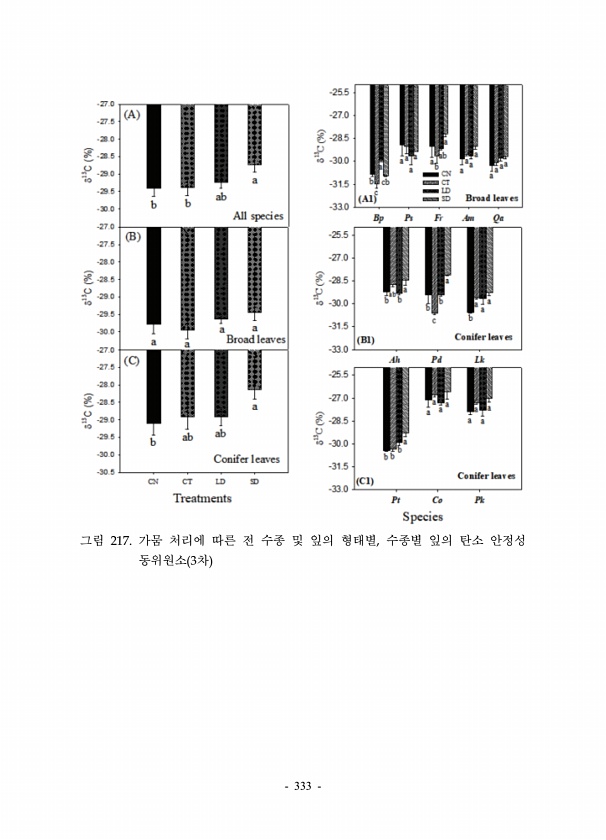 333 그림 217. 가뭄 처리에 따른 전 수종 및 잎의 형태별, 수종별 잎의 탄소 안정성 동위원소 3차