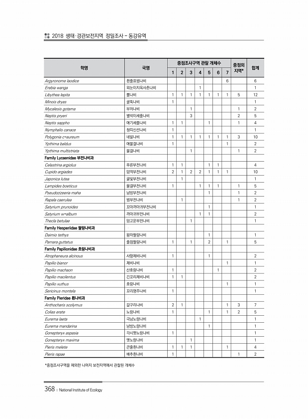 2018 생태·경관보전지역 정밀조사 동강유역 368 ? National Institute of Ecology *중점조사구역을 제외한 나머지 보전지역에서 관찰된 개체수 학명 국명 중점조사구역 관찰 개체수 중점외 1 2 3 4 5 6 7 지역* 합계 Argyronome laodice 흰줄표범나비 6 6 Erebia wanga 외눈이지옥사촌나비 1 1 Libythea lepita 뿔나비 1 1 1 1 1 1 1 5 12 Minois dryas 굴뚝나비 1 1 Mycalesis gotama 부처나비 1 1 2 Neptis pryeri 별박이세줄나비 3 2 5 Neptis sappho 애기세줄나비 1 1 1 1 4 Nymphalis canace 청띠신선나비 1 1 Polygonia c-aureum 네발나비 1 1 1...