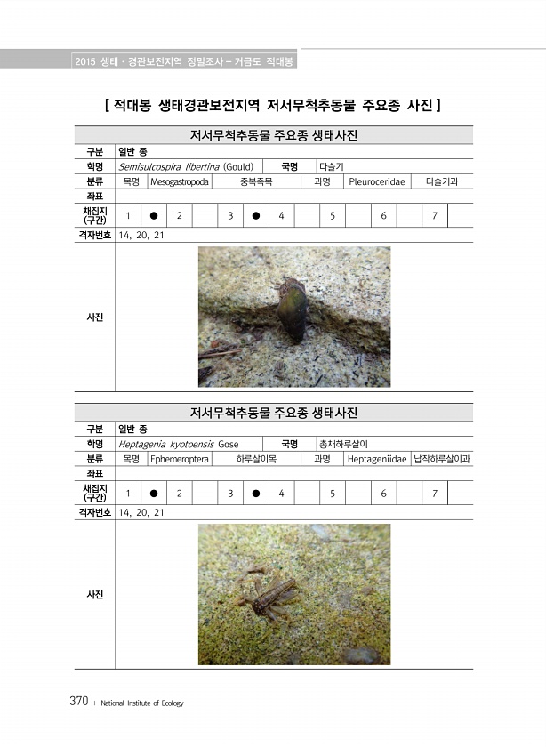 2015 생태·경관보전지역 정밀조사 거금도 적대봉 370 ? National Institute of Ecology [ 적대봉 생태경관보전지역 저서무척추동물 주요종 사진 ] 저서무척추동물 주요종 생태사진 구분 일반 종 학명 Semisulcospira libertina Gould 국명 다슬기 분류 목명 Mesogastropoda 중복족목 과명 Pleuroceridae 다슬기과 좌표 채집지 구간 1 ● 2 3 ● 4 5 6 7 격자번호 14, 20, 21 사진 저서무척추동물 주요종 생태사진 구분 일반 종 학명 Heptagenia kyotoensis Gose 국명 총채하루살이 분류 목명 Ephemeroptera 하루살이목 과명 Heptageniidae 납작하루살이과 좌표 채집지 구간 1 ● 2 3 ● 4 5 6 7...