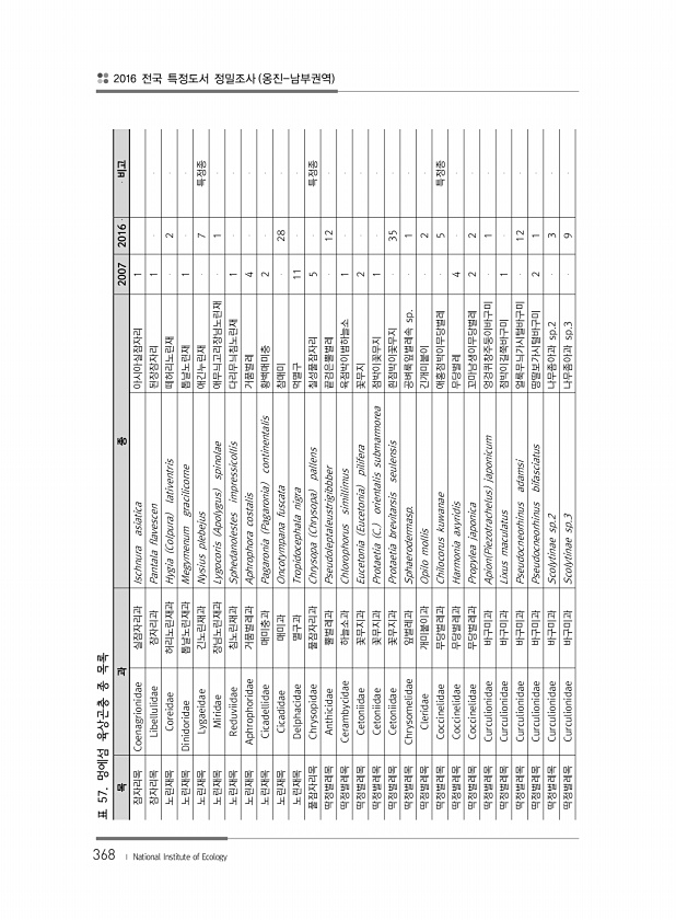 368 목 과 종 2007 2016 비고 잠자리목 Coenagrionidae 실잠자리과 Ischnura asiatica 아시아실잠자리 1 잠자리목 Libellulidae 잠자리과 Pantala flavescen 된장잠자리 1 노린재목 Coreidae 허리노린재과 Hygia Colpura lativentris 떼허리노린재 2 노린재목 Dinidoridae 톱날노린재과 Megymenum gracilicorne 톱날노린재 1 노린재목 Lygaeidae 긴노린재과 Nysius plebejus 애긴누린재 7 특정종 노린재목 Miridae 장님노린재과 Lygocoris Apolygus spinolae 애무늬고리장님노린재 1 노린재목 Reduviidae 침노린재과 Sphedanoles...