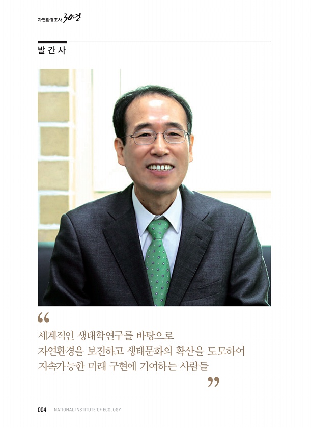 발 간 사 세계적인 생태학연구를 바탕으로 자연환경을 보전하고 생태문화의 확산을 도모하여 지속가능한 미래 구현에 기여하는 사람들 004 NATIONAL INSTITUTE OF ECOLOGY자연환경조사30년