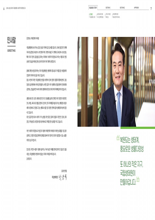 6 2018-2020 제2차 국립생태원 사회적가치경영보고서 국립생태원 STORY SECTIONⅠ SECTIONⅡ APPENDIX 7 존경하는 이해관계자 여러분 국립생태원에 보내 주시는 많은 관심과 격려에 깊은 감사를 드립니다. 2018년 발간한 첫 번째 지속가능경영보고서 20152017년 에 이어, 이번에 내놓은 두 번째 보고서 20182020년 는 특히 우리 기관의 공공성을 강조하는 의미에서 ‘사회적가치경영보고서’라는 이름으로 한층 성숙한 모습을 여러분 앞에 선보이게 되어 더욱 기쁘게 생각합니다. 올해로 개원 8년을 맞이하는 우리 국립생태원은 생태계의 중요성과 가치를 많은 사람들에게 전달하기 위하여 최선을 다하고 있습니다. 충남 서천에 위치한 국립생태원 본원을 비롯하여 경북 영양의 멸종위기종복원센터, 경남...