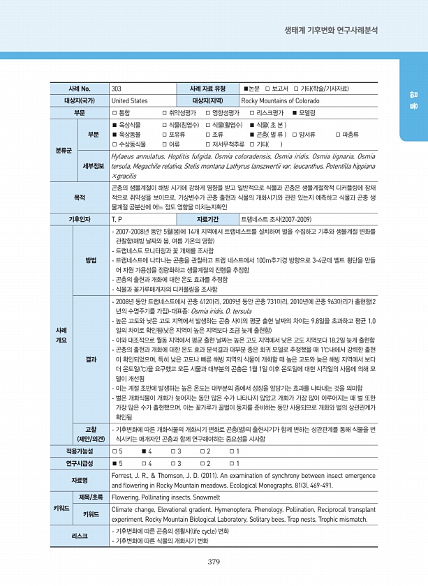 379 생태계 기후변화 연구사례분석 통 합 사례 No. 303 사례 자료 유형 ■논문 □ 보고서 □ 기타 학술/기사자료 대상지 국가 United States 대상지 지역 Rocky Mountains of Colorado 부문 □ 통합 □ 취약성평가 □ 영향성평가 □ 리스크평가 ■ 모델링 분류군 부문 ■ 육상식물 □ 식물 침엽수 □ 식물 활엽수 ■ 식물 초 본 ■ 육상동물 □ 포유류 □ 조류 ■ 곤충 벌 류 □ 양서류 □ 파충류 □ 수상동식물 □ 어류 □ 저서무척추류 □ 기타 세부정보 Hylaeus annulatus, Hoplitis fulgida, Osmia coloradensis, Osmia iridis, Osmia lignaria, Osmia tersula, Megachile relativa, Steli...