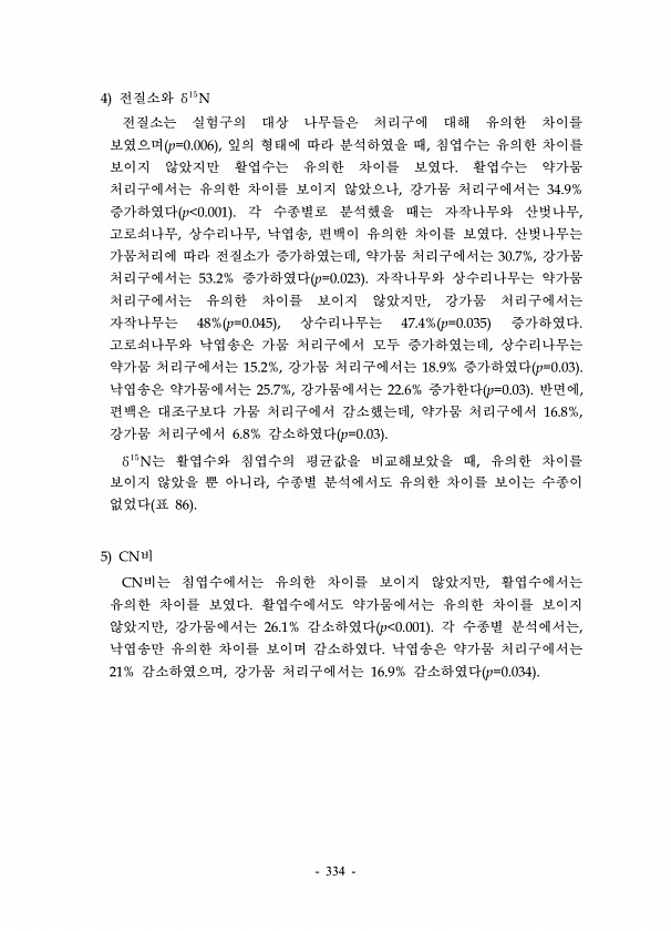 334 4 전질소와 δN 전질소는 실험구의 대상 나무들은 처리구에 대해 유의한 차이를 보였으며 p=0.006 , 잎의 형태에 따라 분석하였을 때, 침엽수는 유의한 차이를 보이지 않았지만 활엽수는 유의한 차이를 보였다. 활엽수는 약가뭄 처리구에서는 유의한 차이를 보이지 않았으나, 강가뭄 처리구에서는 34.9% 증가하였다 p 0.001 각 수종별로 분석했을 때는 자작나무와 산벚나무, 고로쇠나무, 상수리나무, 낙엽송, 편백이 유의한 차이를 보였다. 산벚나무는 가뭄처리에 따라 전질소가 증가하였는데, 약가뭄 처리구에서는 30.7%, 강가뭄 처리구에서는 53.2% 증가하였다 p=0.023 자작나무와 상수리나무는 약가뭄 처리구에서는 유의한 차이를 보이지 않았지만, 강가뭄 처리구에서는 자작나무는 48% p=0.045 ...